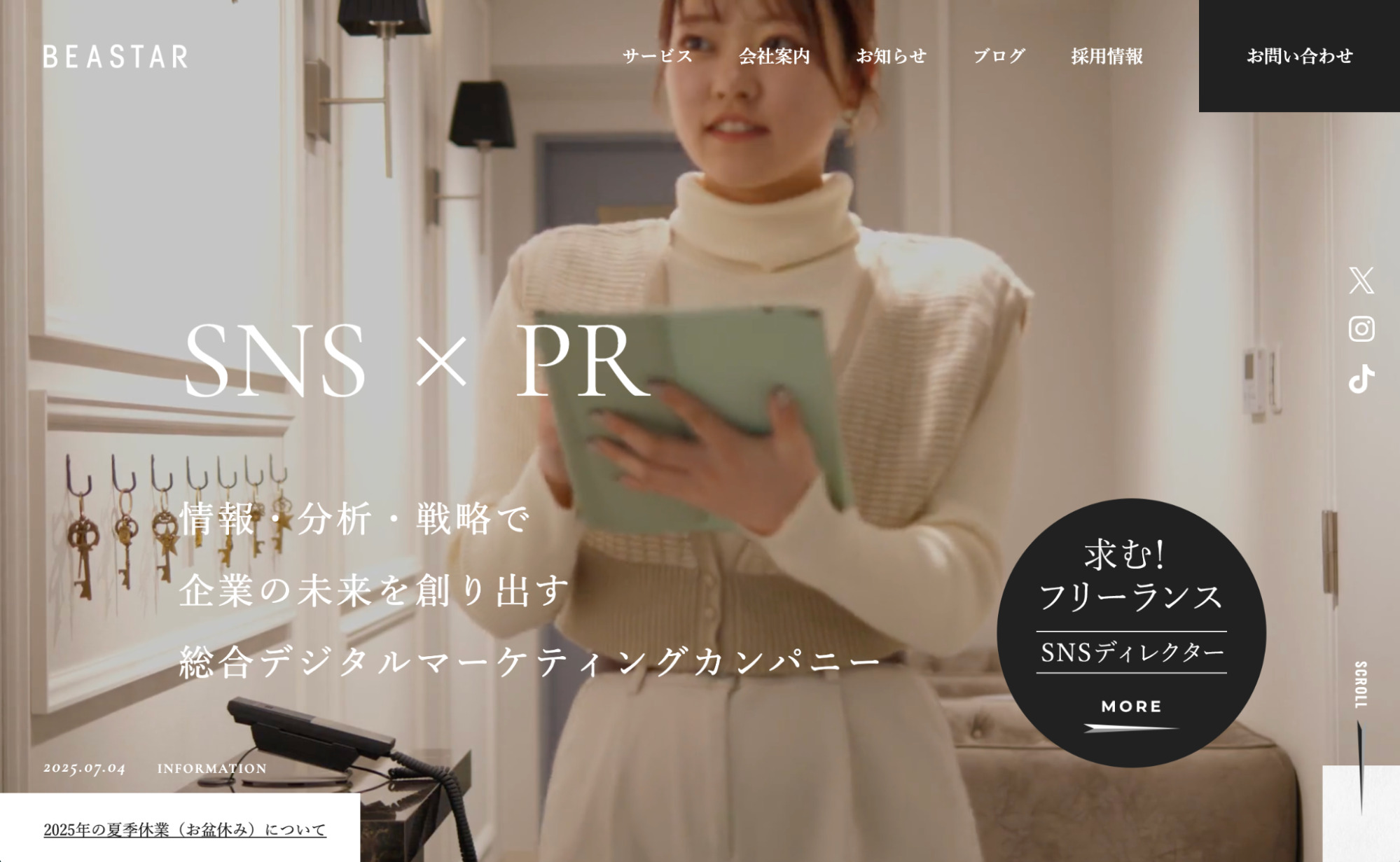 BEASTAR株式会社は、大阪を拠点にSNS運用代行を展開している会社です。TikTokのアカウント設計から動画制作、投稿、効果測定まで一括で支援できる体制を持っています。