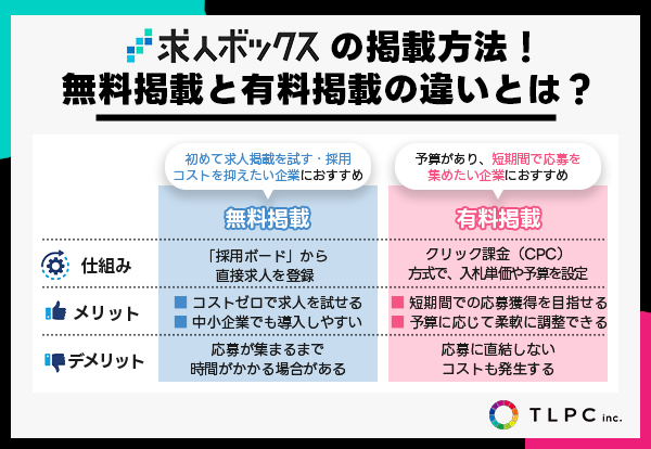 求人ボックスには、無料掲載と有料掲載(クリック課金型)の2つの方法があります。