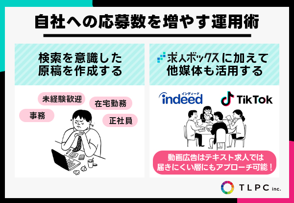 | ・検索を意識した原稿を作成する ・求人ボックスに加えて他媒体も活用する |