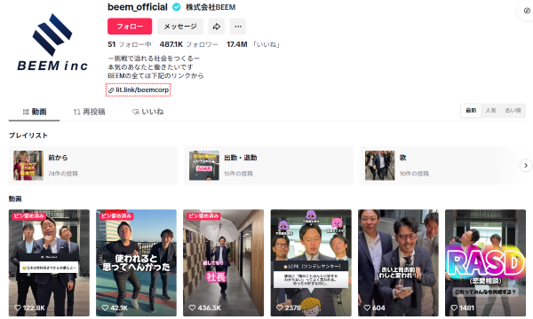 株式会社BEEM(https://www.tiktok.com/@beem_official)は、ダンスや会社ネタのコントを用いてユーモアたっぷりの動画を配信し、オリジナル用語を使ったコンテンツで注目を集めています。