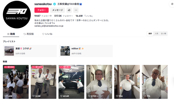 三和交通株式会社(https://www.tiktok.com/@sanwakotsu)では、ネクタイを小さく結んだおじさん部長が踊る動画が話題になりました。