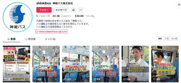 神姫バス株式会社(https://www.tiktok.com/@shinkibus)は、バス運転士という一見地味になりがちな職種の魅力をアットホームな動画で発信しています。