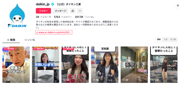 大手企業のダイキン工業株式会社(https://www.tiktok.com/@daikin_jp)は、TikTokを活用して商品の情報や会社紹介を投稿しています。