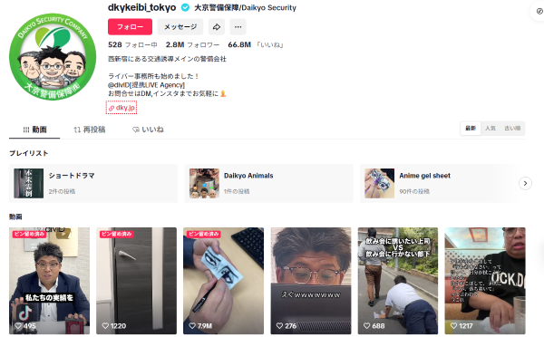 警備業の大京警備保障株式会社(https://www.tiktok.com/@dkykeibi_tokyo)は、以下のようなエンタメ要素を前面に出しています。
