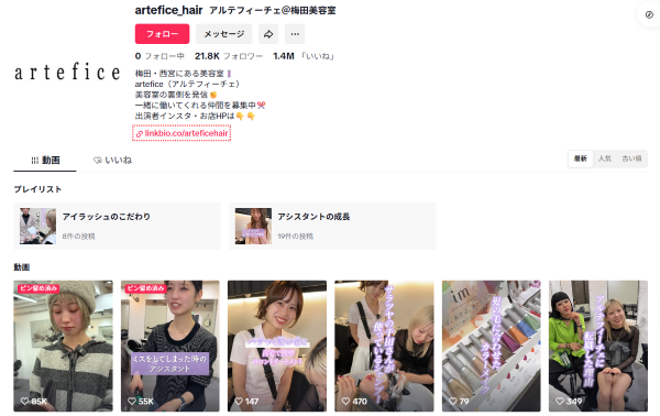 美容業界の株式会社artefice(https://www.tiktok.com/@artefice_hair)は、以下のような動画を配信しています。
