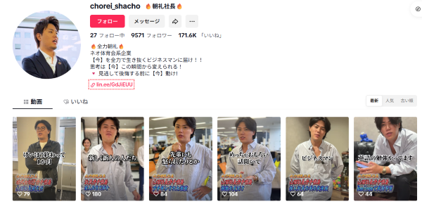 株式会社EF(https://www.tiktok.com/@chorei_shacho)は、社長に密着した動画シリーズを展開しています。